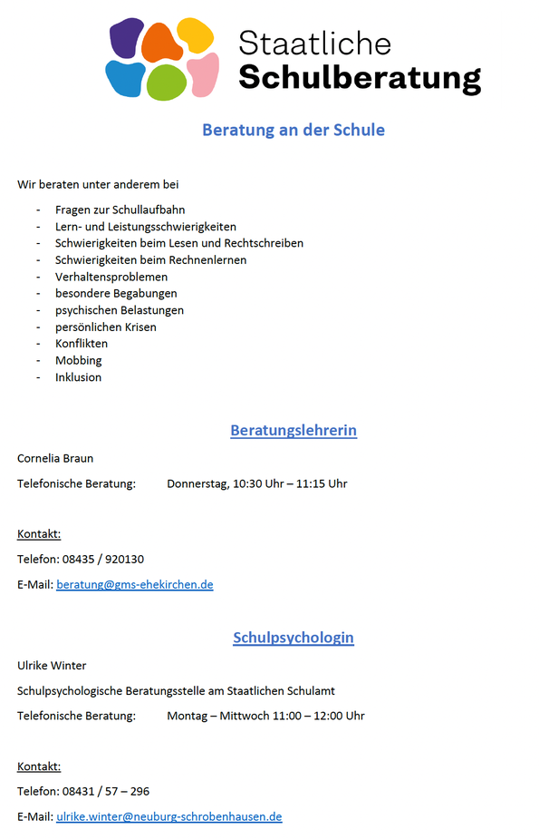 Informationen zur Beratung durch Beratungslehrkraft und Schulpsychologin